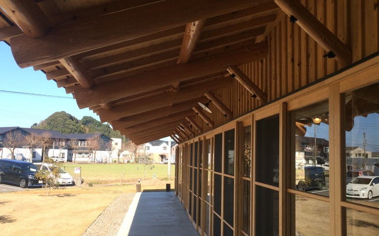 日本のモダニズム建築 に大きな影響を与えた建築家アントニン・レーモンドの自邸を 再現した施設です。この施設の基本構想を行ったのはレーモンド設計事務所に在籍して いた津端修一氏であり、晩年に手掛けた遺作ともなりました。 登り梁と柱を二つ割の丸太で挟む鋏状トラス、縦張り板の外装、軽い鉄板屋根や深い 軒、土間コンクリートの床などレーモンドの代表的なスタイル を用いることで、内部と外部の融合による中間領域を創り出し ています。 4棟あるうちの2棟は就労支援施設としてのカフェ、もう1 棟は訪問看護ステーションとなっています。連続した2棟は就 労支援として働く身障者と一般の人、施設と地域のつながりを 示したいという施主の思いが込められています。 また津端氏の掲げていたキッチンガーデンの思想も取り入れ、 職員が耕した敷地内の畑でさまざまな野菜も育てています。